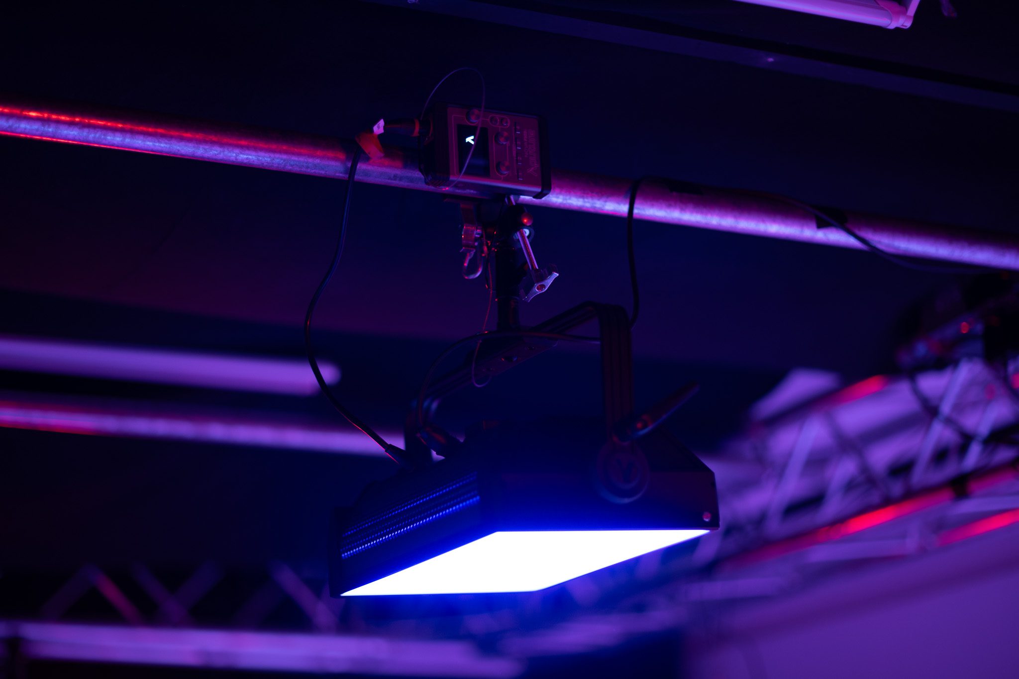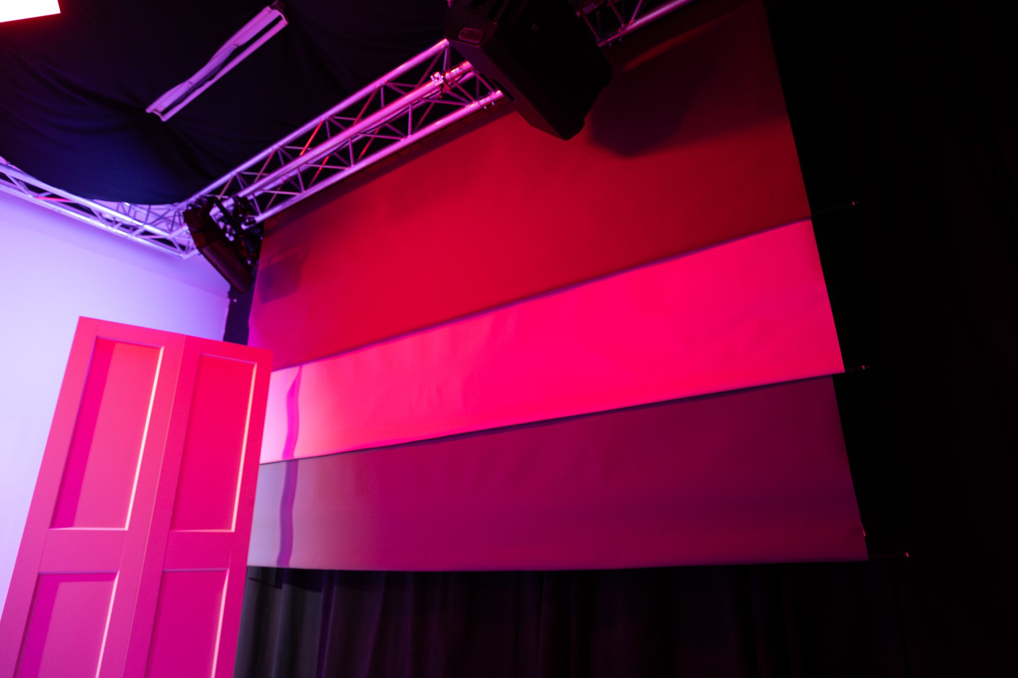 We hebben een witte limbo van 7,5 x 4,5 meter. Aan de truss hangen 3 Nova p300C LED Panels om de hele limbo te verlichten in elke kleur, makkelijk te besturen met een iPad. Ook hangt er een beamer die op de hele achterwand kan projecteren.