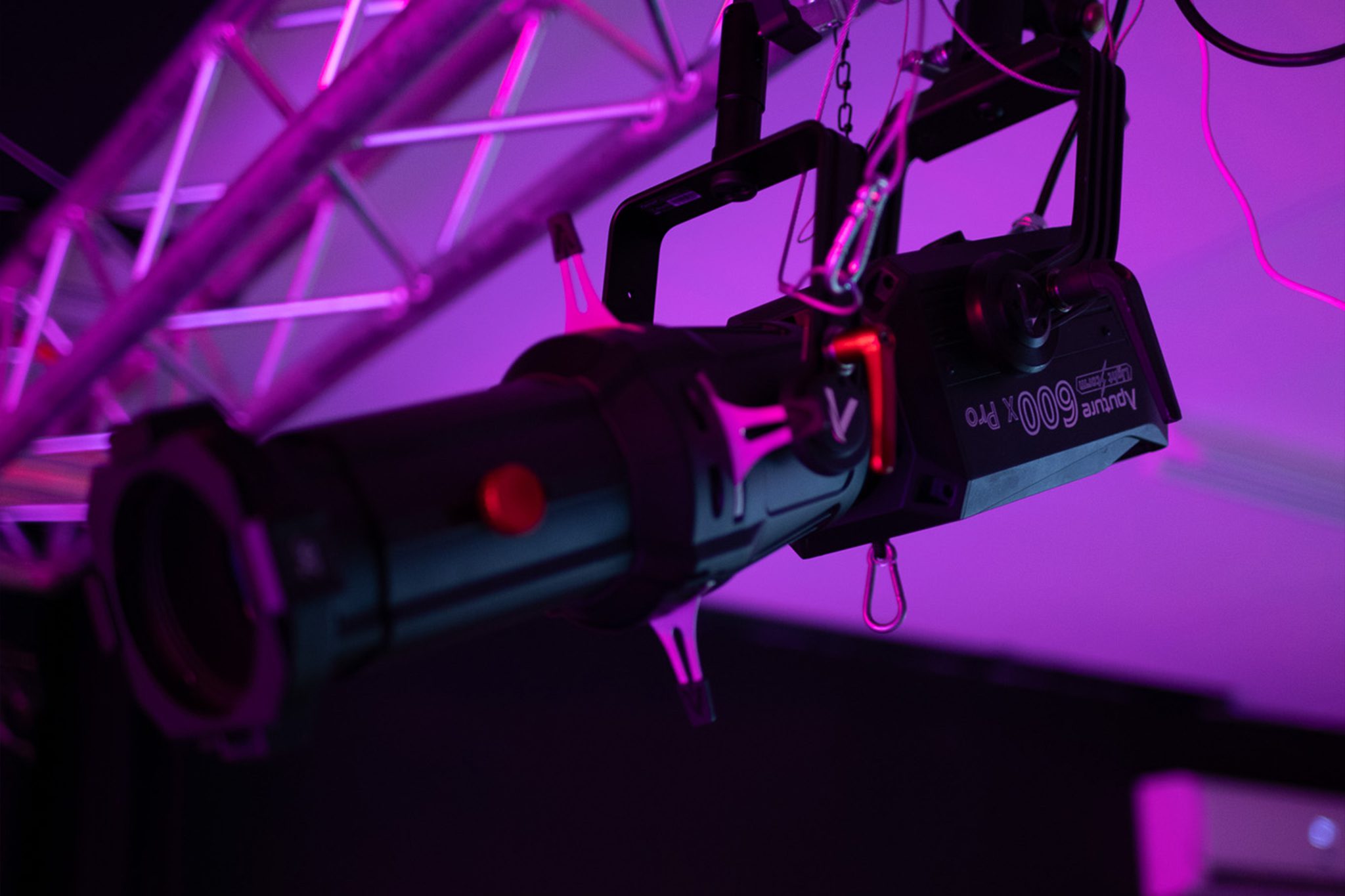 In onze truss hangen backdrops, een beamer en 3 Nova p300C LED Panels.